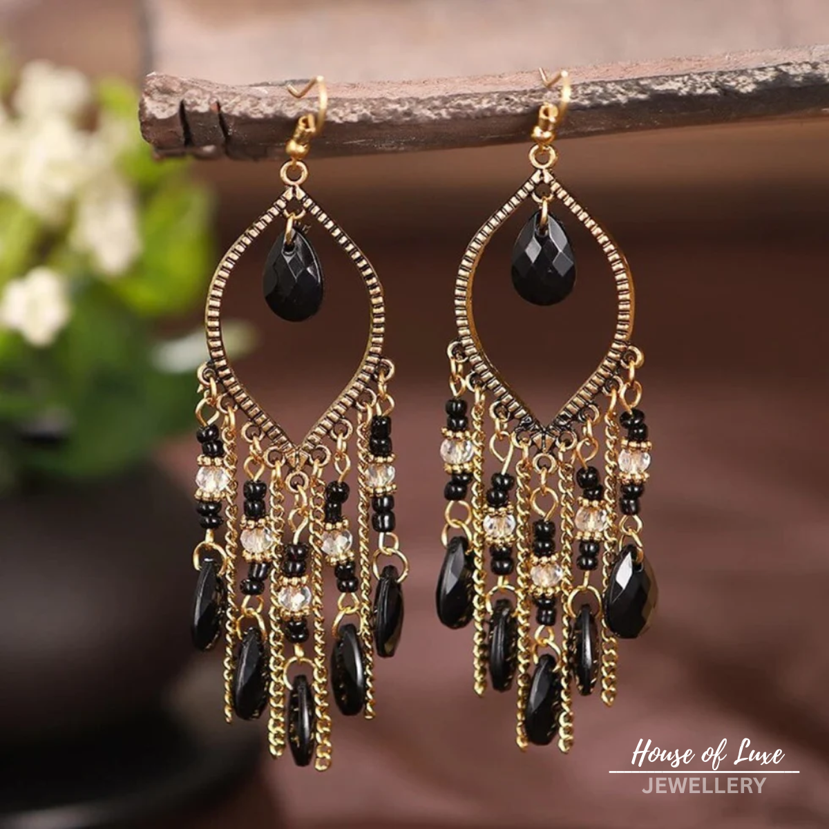 BLACK ZIRCONIA BOHO MANDALA DANGLING EARRINGS