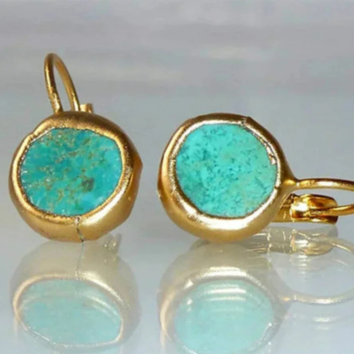 Step back in time with these stunning vintage turquoise earrings – where timeless charm meets a touch of gold-tone glamour. Each pair showcases vibrant turquoise stones that pop with character, framed in a beautifully warm golden finish. Whether you're dressing up for a night out or adding flair to your everyday look, these earrings are your go-to statement piece. Light, elegant, and effortlessly chic – they’re made to turn heads.