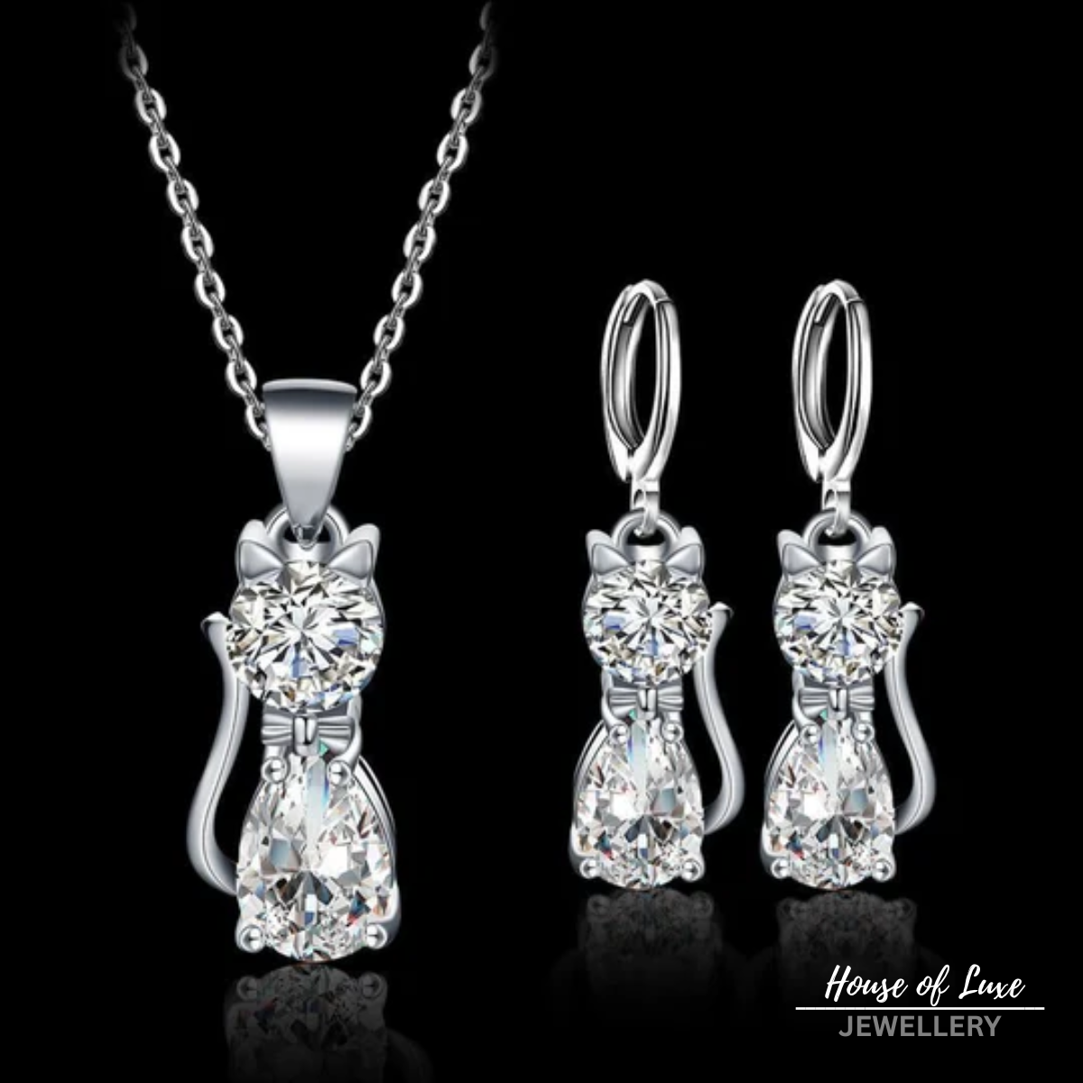 SET NECKLACE + EARRINGS HAPPY CATS SILVER AND POLISHED WHITE ZIRCONIUM
