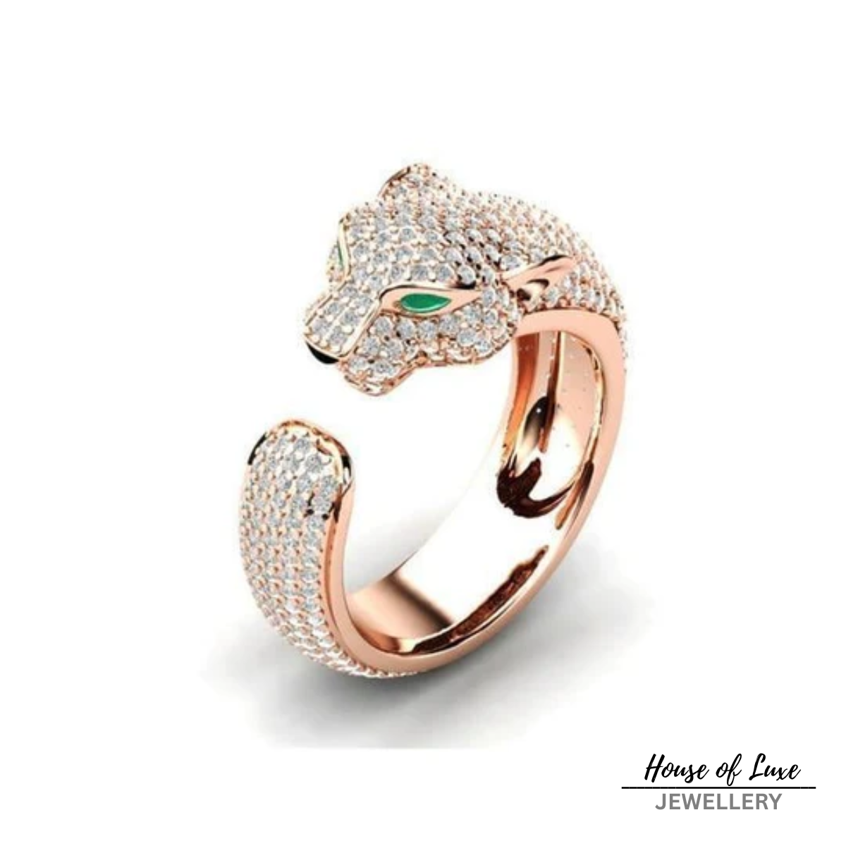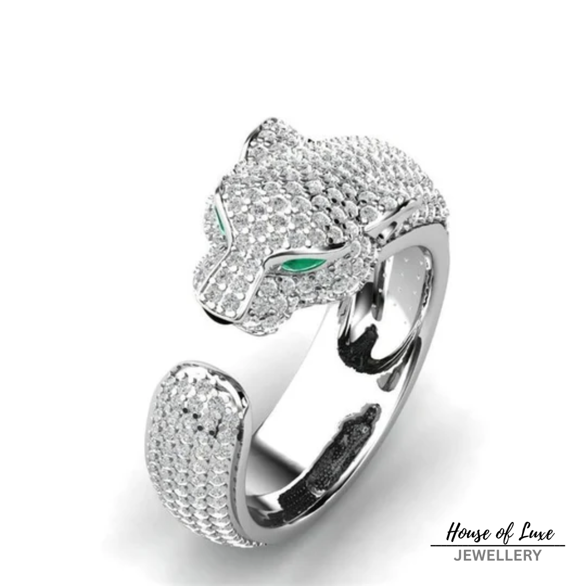 ADJUSTABLE JAGUAR RING IN SILVER AND ROSE GOLD WITH GREEN ZIRCONIA EYES
