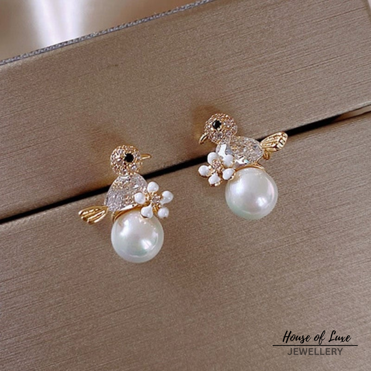 LUXURY BIRDIE EARRINGS IN CUBIC ZIRCONIA AND PEARL INLAY