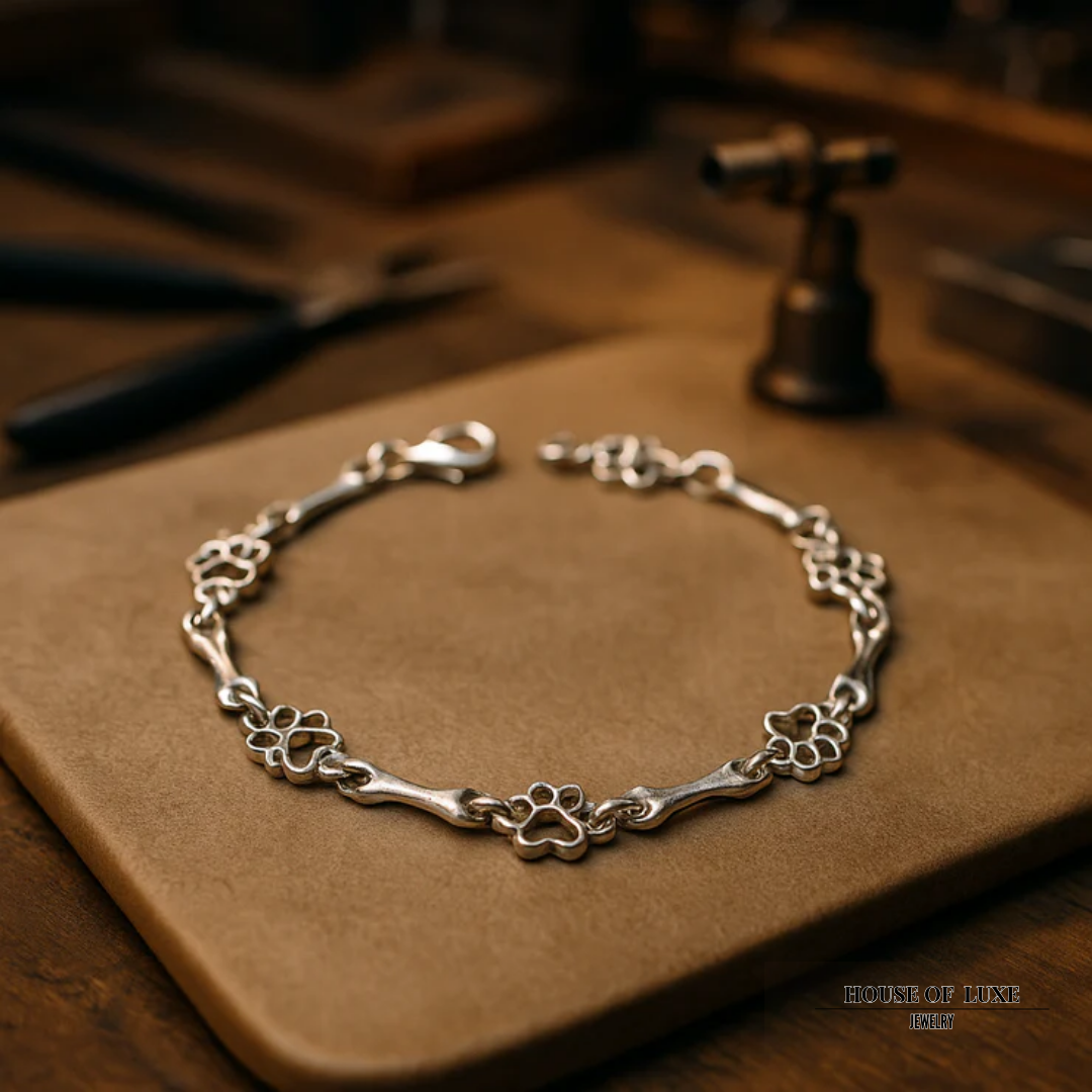 SILVER DOG PAW AND BONE CHARMS BRACELET