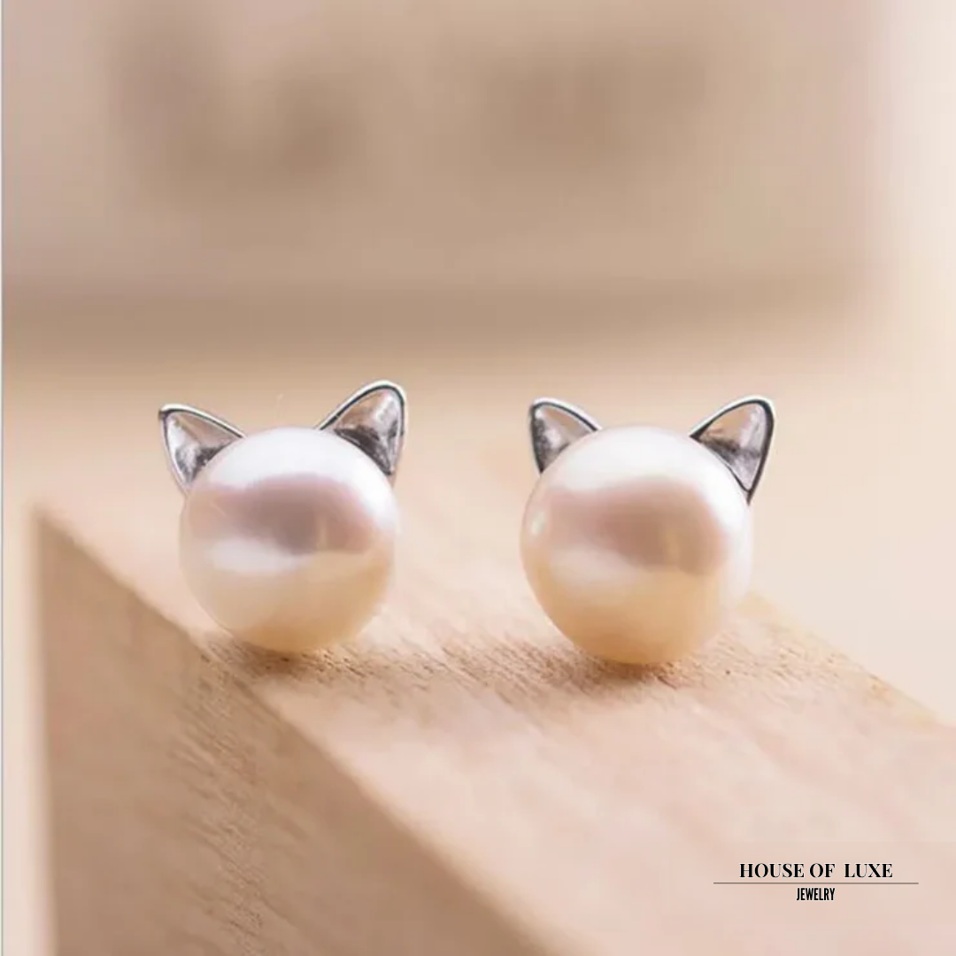 STERLING SILVER CAT PEARL STUD EARRINGS