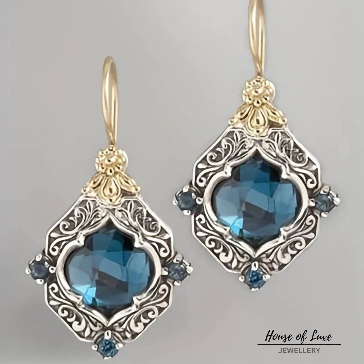 VINTAGE GOLD SILVER EARRINGS WITH BLUE CRYSTALS